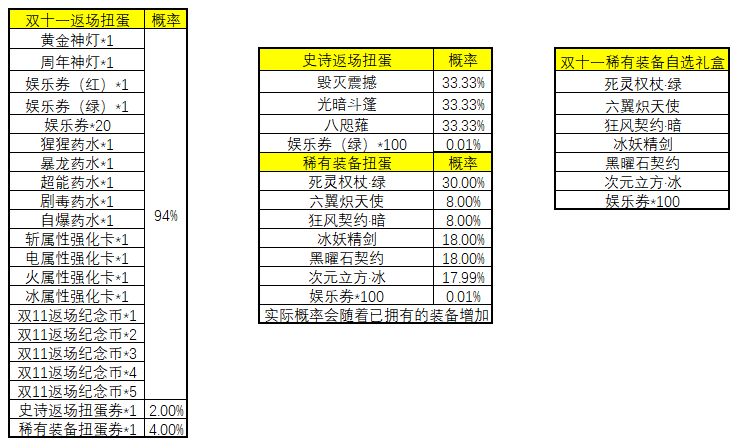 ※ 扭蛋获得的返场纪念币可在纪念币活动商店中兑换装备:毁灭震撼(200个),光暗斗篷(200个),八咫薙(200个),双十一稀有装备自选礼盒(130个),娱乐券(绿)x1(1个)。