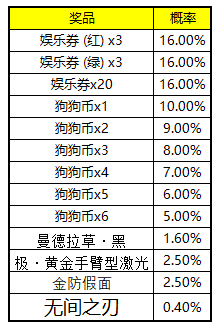 ※获得的狗狗币可在本页面兑换商店中兑换装备:无间之刃(400个),曼德拉草·黑(200个),极·黄金手臂型激光(200个),金防假面(200个),娱乐券(绿)x1(1个)。