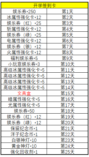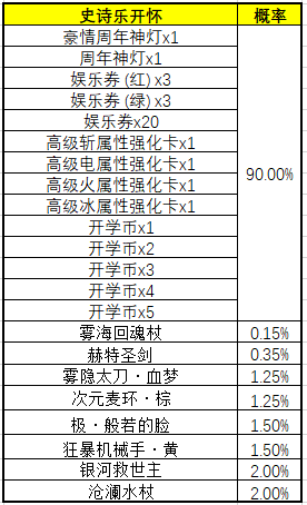 | 娱乐券(红)*1 3% | 黄金神灯*10 15% | 娱乐券(绿)*1 15% | 冰属性随机强化银卡 *1 0.02% |